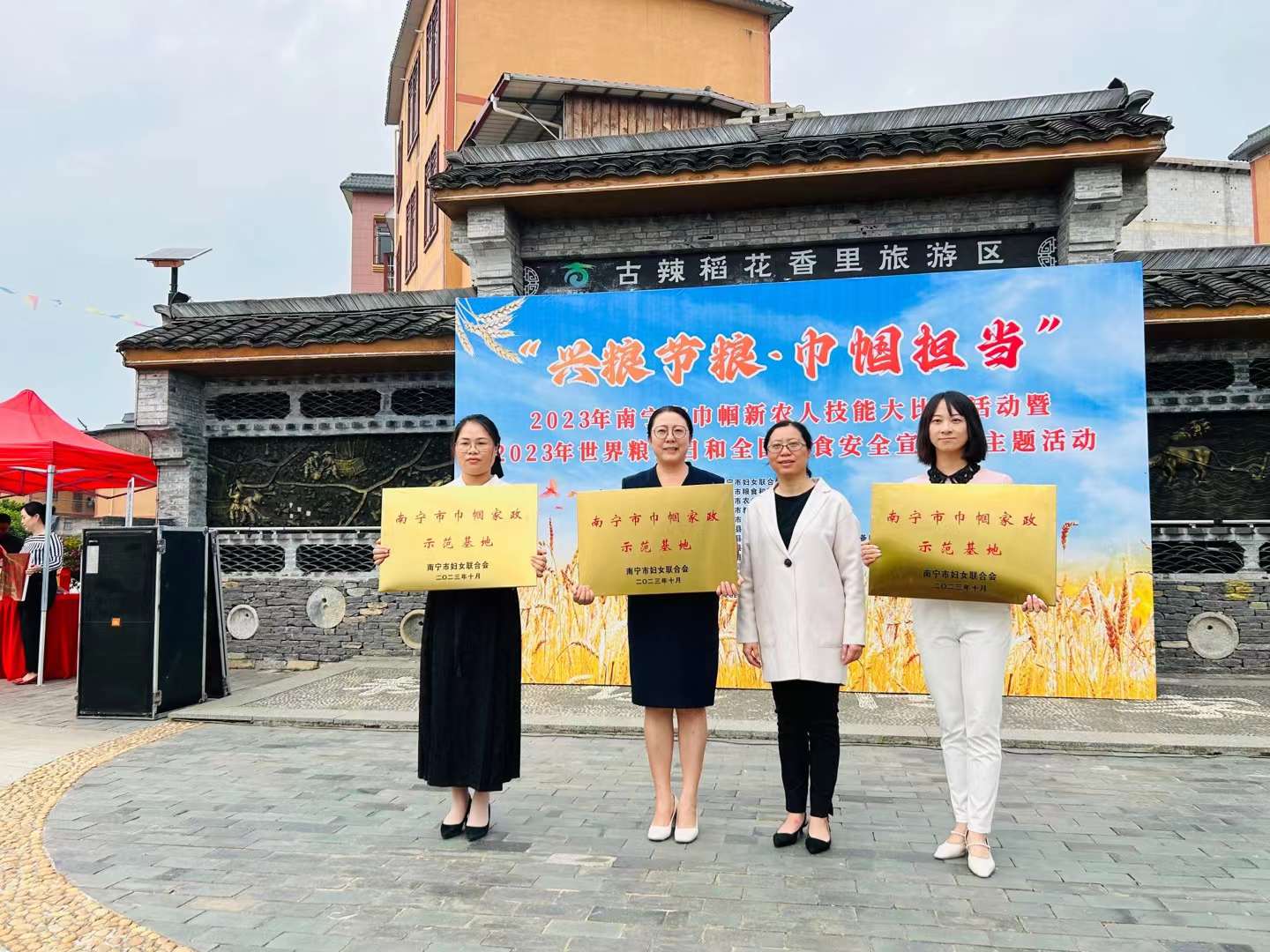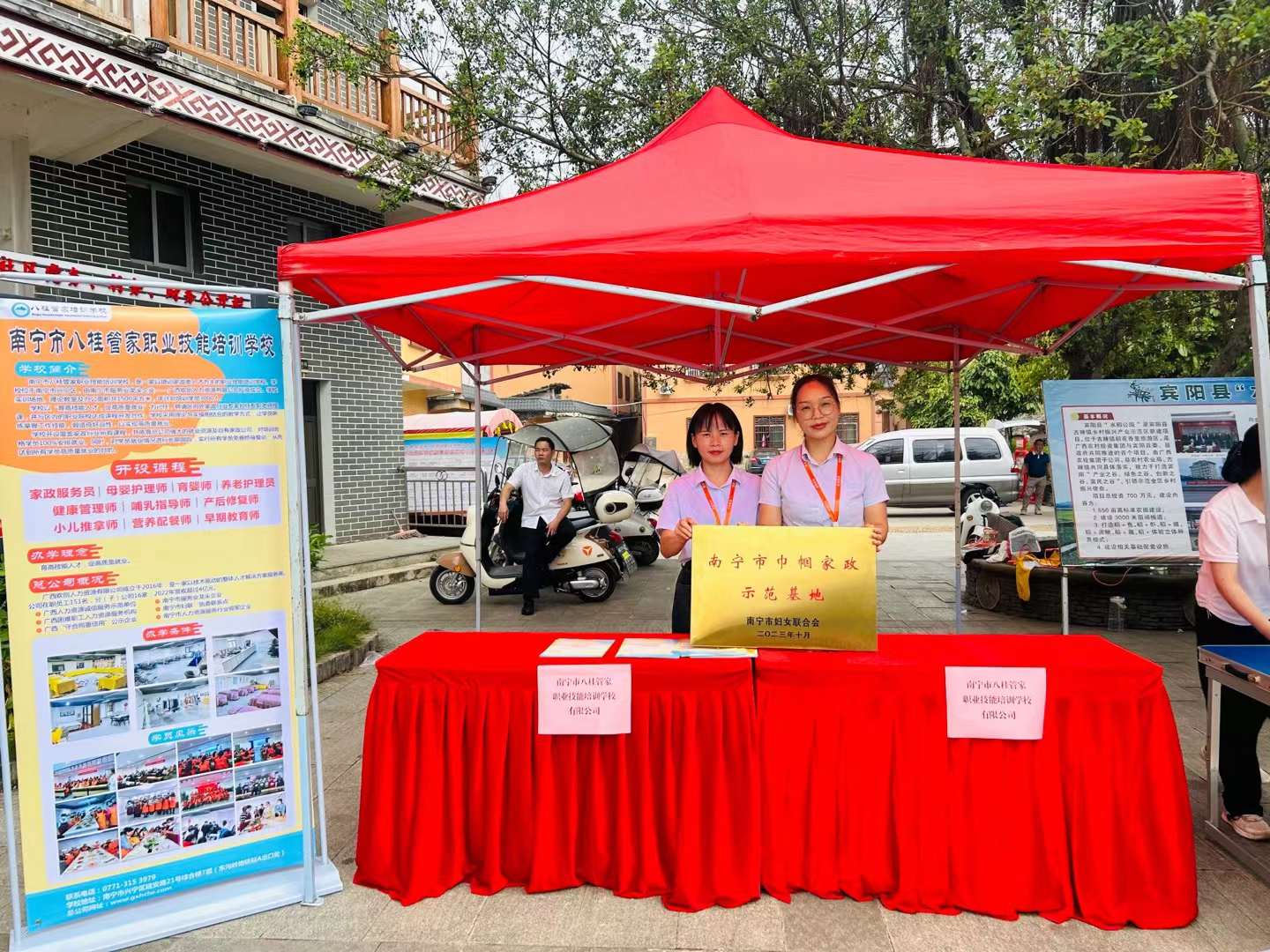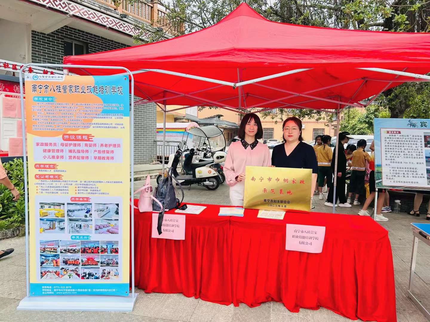 经过严格评审和现场考察,南宁市妇联确定我公司下属培训学校——南宁市八桂管家职业技能培训学校为“南宁市巾帼家政示范基地”。10月24日,南宁市妇联在宾阳县古辣镇开展的“兴粮节粮,巾帼担当”2023年南宁市巾帼新农人技能大比拼活动暨2023年世界粮食日和全国粮食安全宣传周主题活动上,南宁市妇联领导为我司培训学校颁发了“南宁市巾帼家政示范基地”牌匾。