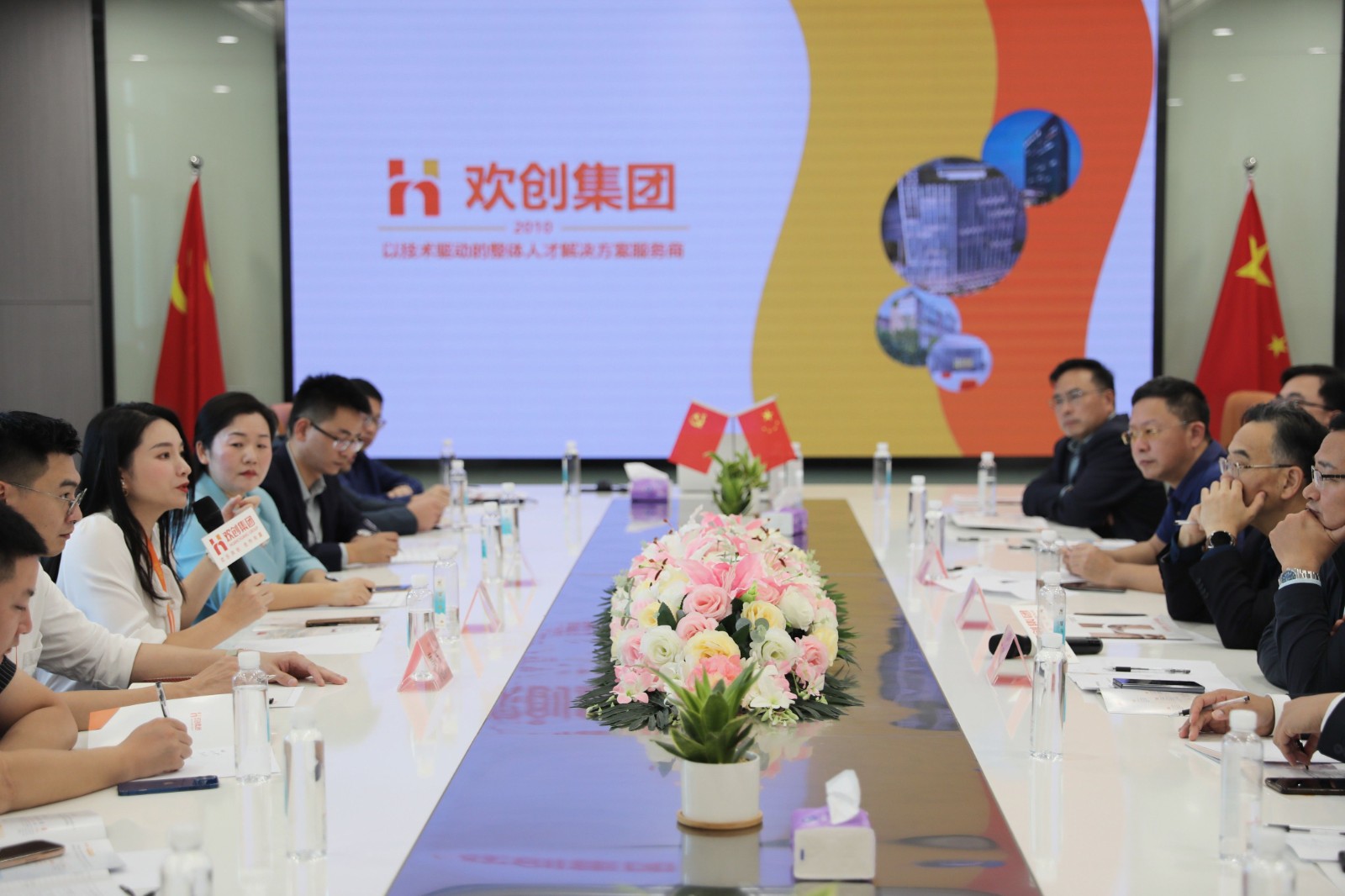会议伊始,欢创集团党支部书记、集团总裁陈文舒长为来宾介绍欢创集团的发展历程、核心产品和商业模式。陈文舒总表示,欢创集团利用先进的技术赋予人力资源行业新的活力,探索出的新模式要广泛传播,希望与众多企业积极分享成果,合作共赢,从而不断开拓创新,迎接挑战,共同推进人力资源产业快速发展,实现新的发展价值。